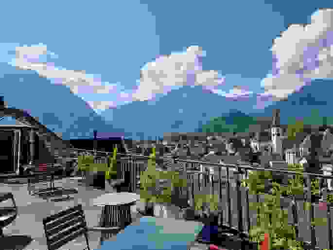 Geniessen Sie die einmalige Aarmühle-Penthouse-Suite mit der wohl schönsten Dachterrasse von Interlaken. Die Suite befindet sich im 5. Stock des Gebäudes Carlton und besteht aus einem grossen Wohn- und Schlafraum, einem separaten zweiten Schlafzimmer, einer geräumigen und vollausgestatteten Küche sowie zwei Badezimmern, davon eines mit Eckbadewanne und das andere mit Sauna. Im oberen 6. Stock befindet sich die Galerie und die grosse Dachterrasse mit einer Vielzahl an Liegestühlen, Tischen und Feuerschale. Auf dem Outdoor-Bett auf der Terrasse träumen Sie unter dem Sternenhimmel. Im Zimmerpreis inbegriffen sind der Eintritt in unser einzigartiges „Oberländer Wellnessdörfli“ und ein Parkplatz für Ihr Auto in unserer Tiefgarage.